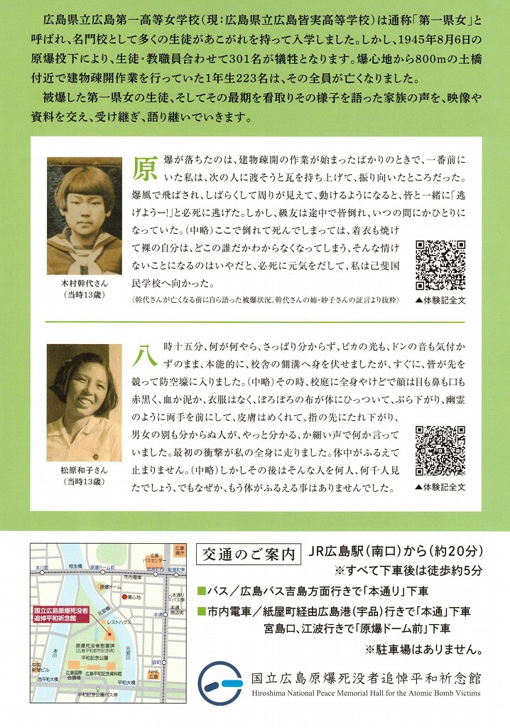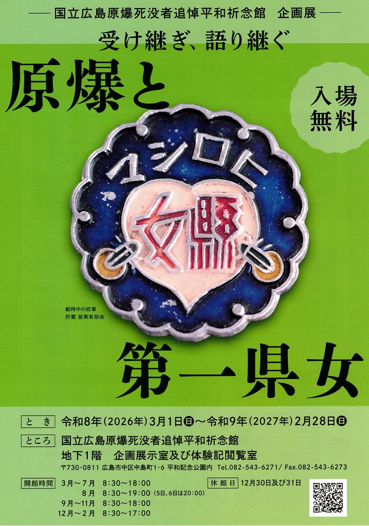 国立広島原爆死没者追悼平和祈念館で企画展「受け継ぎ、語り継ぐ 原爆と第一県女」が催されます。